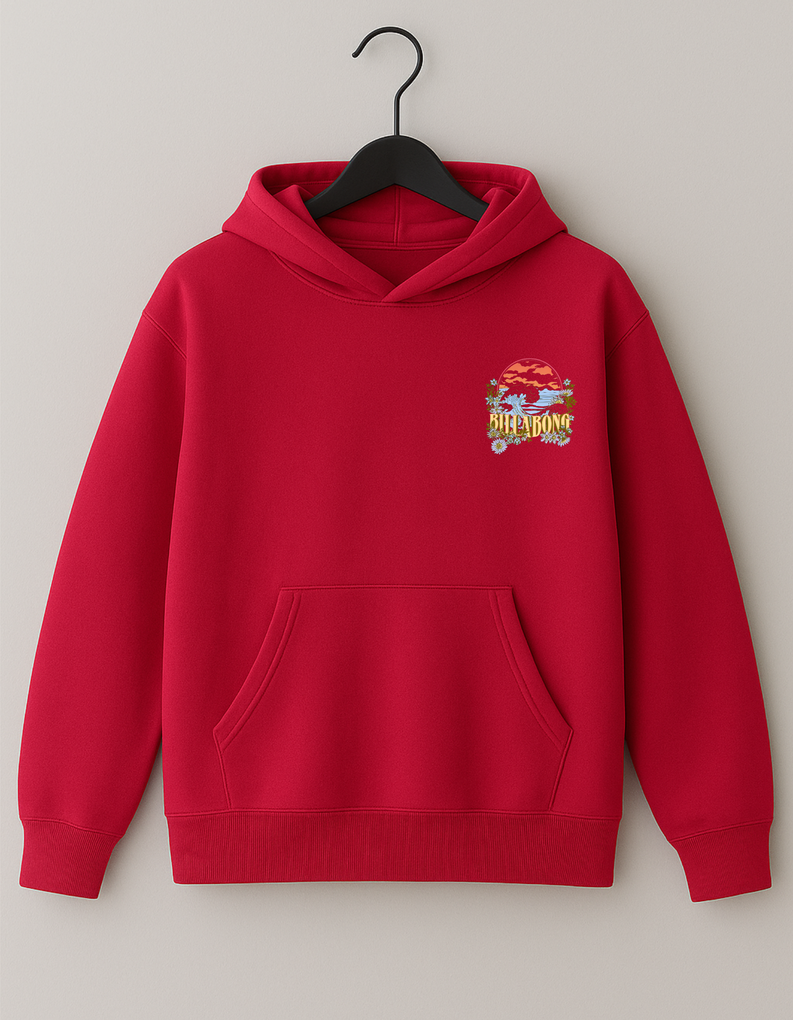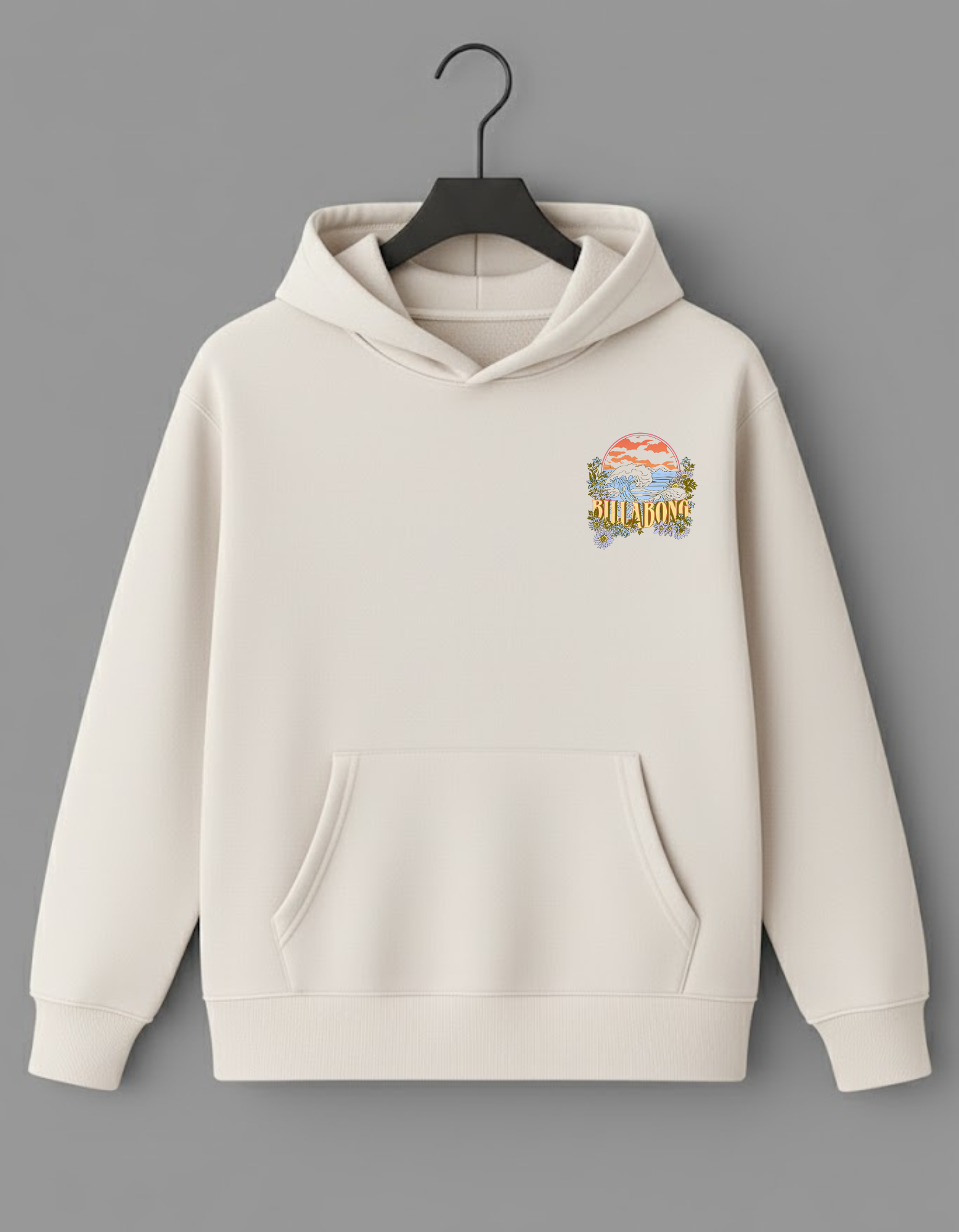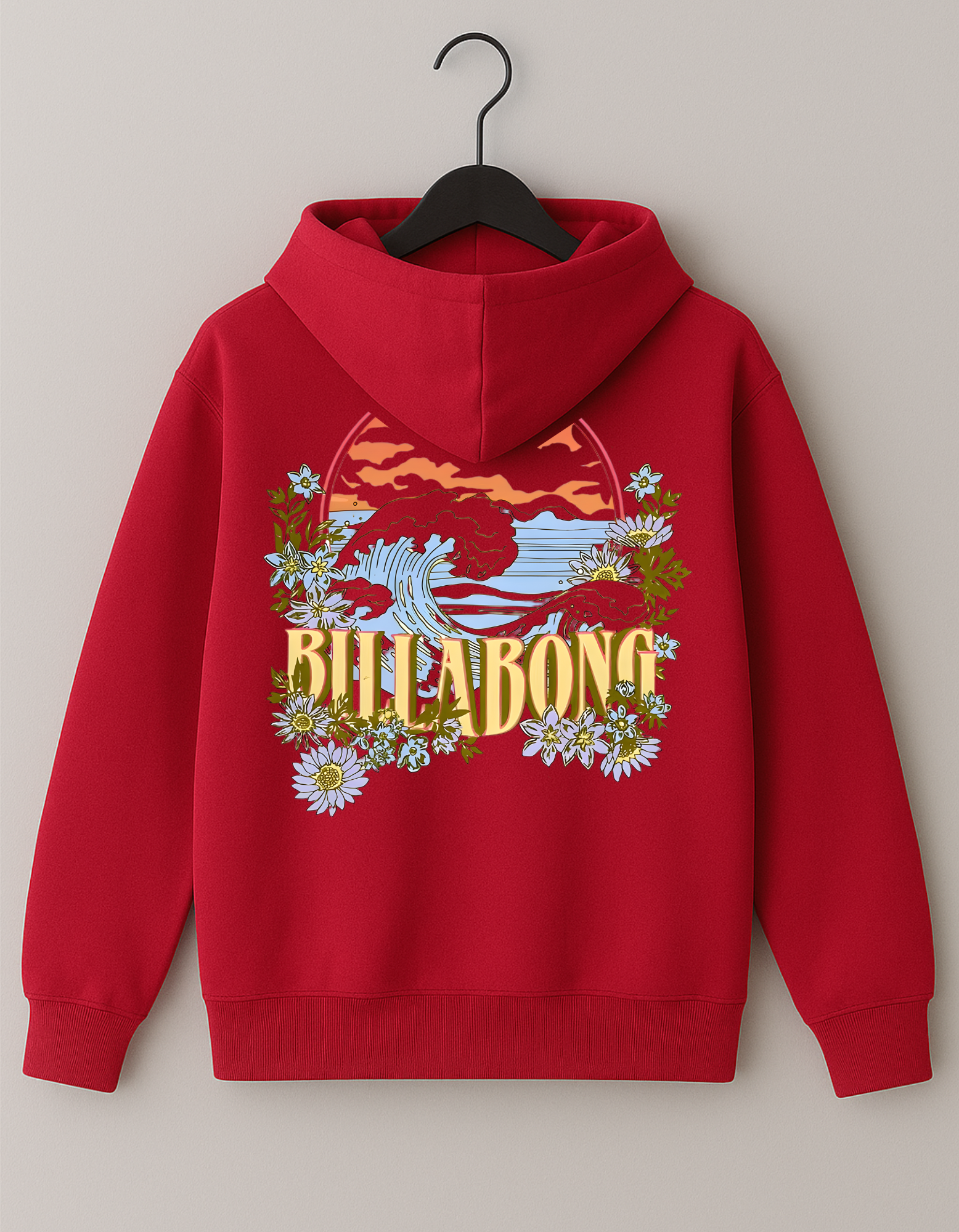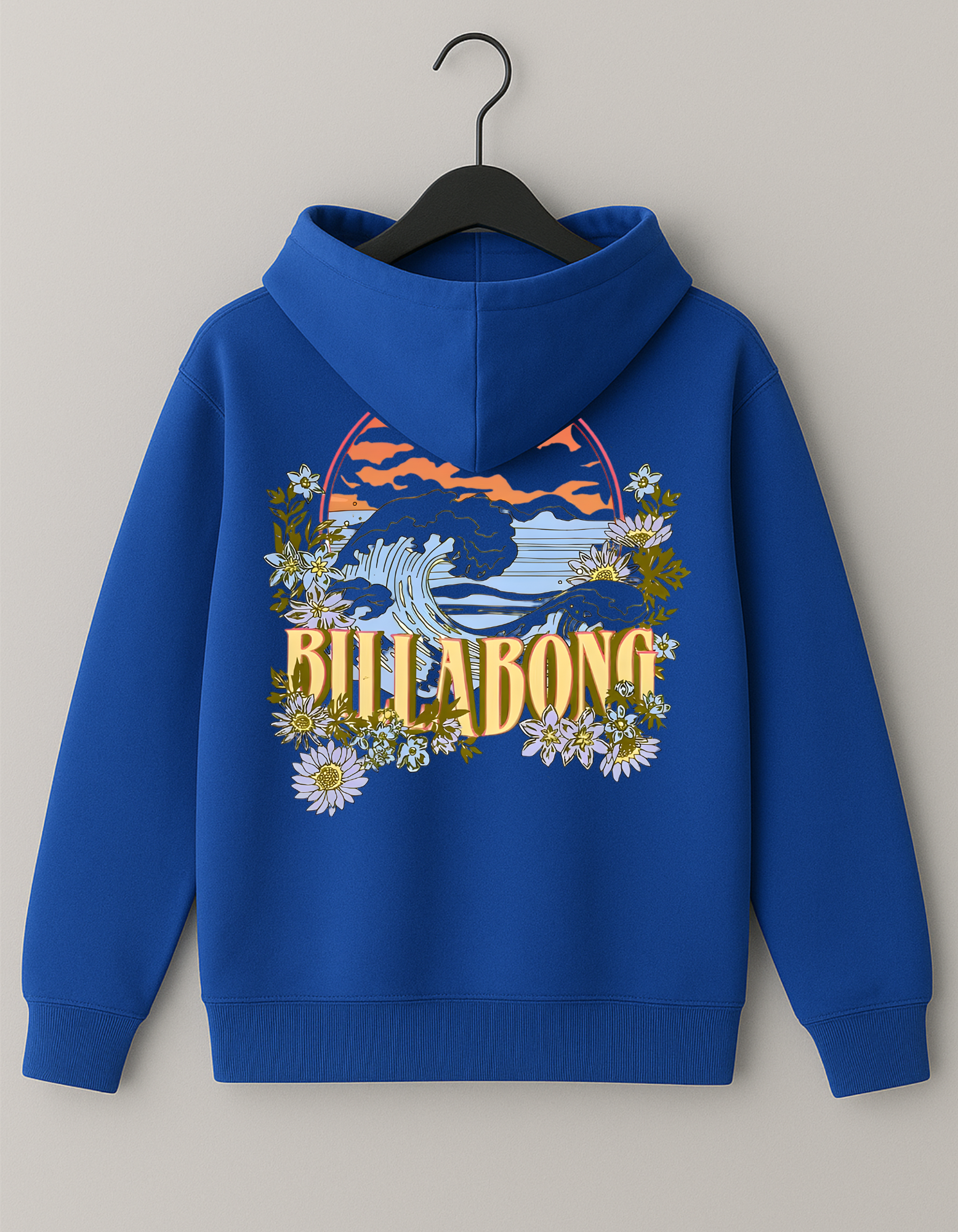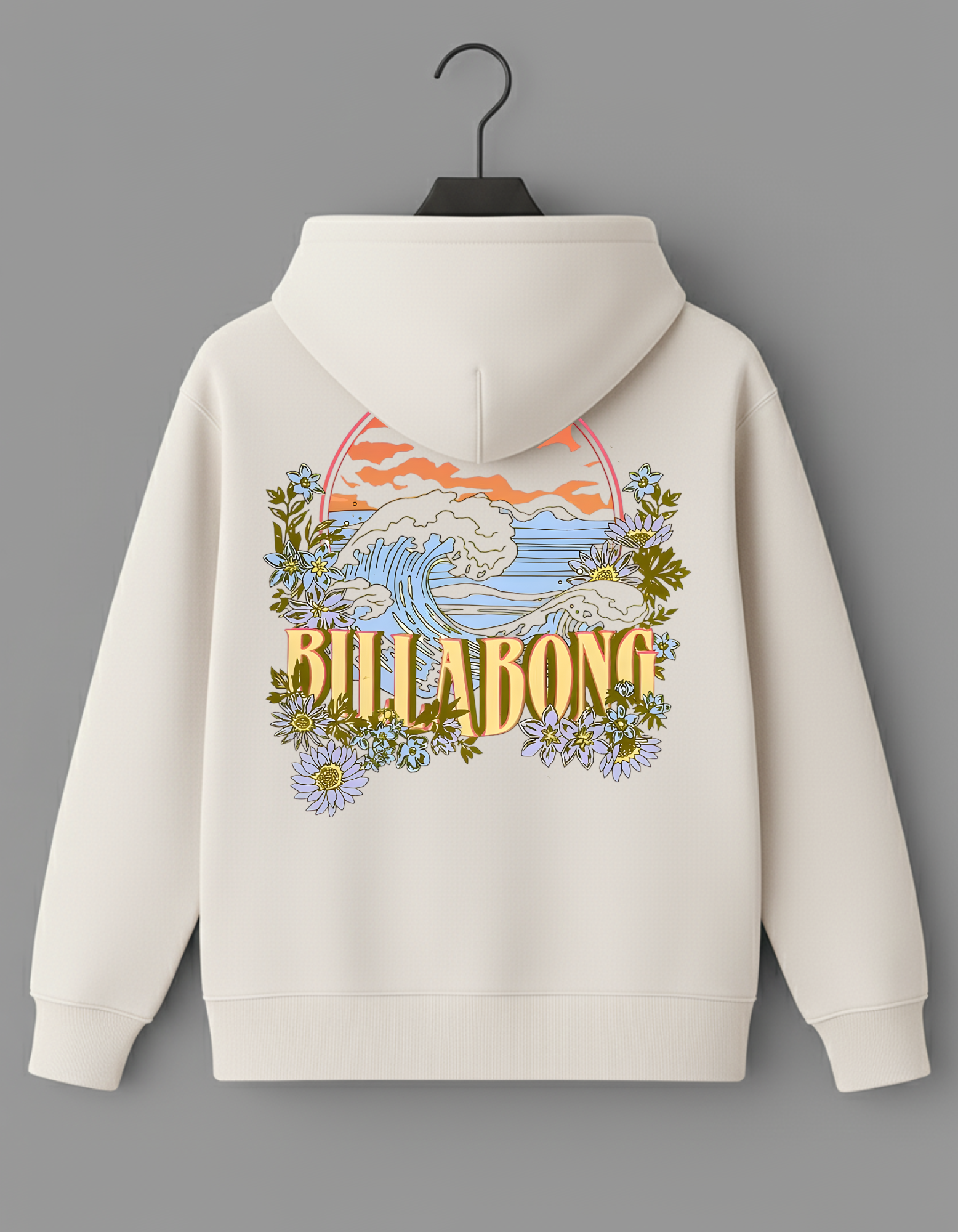This cotton fleece hoodie is a perfect blend of rugged coastal energy and soft, dreamy aesthetics. It features a powerful ocean wave cresting under a sunset, beautifully framed by a soft array of wild daisies and subtle foliage. The text "BILLABONG" is integrated in a retro, sun-faded font