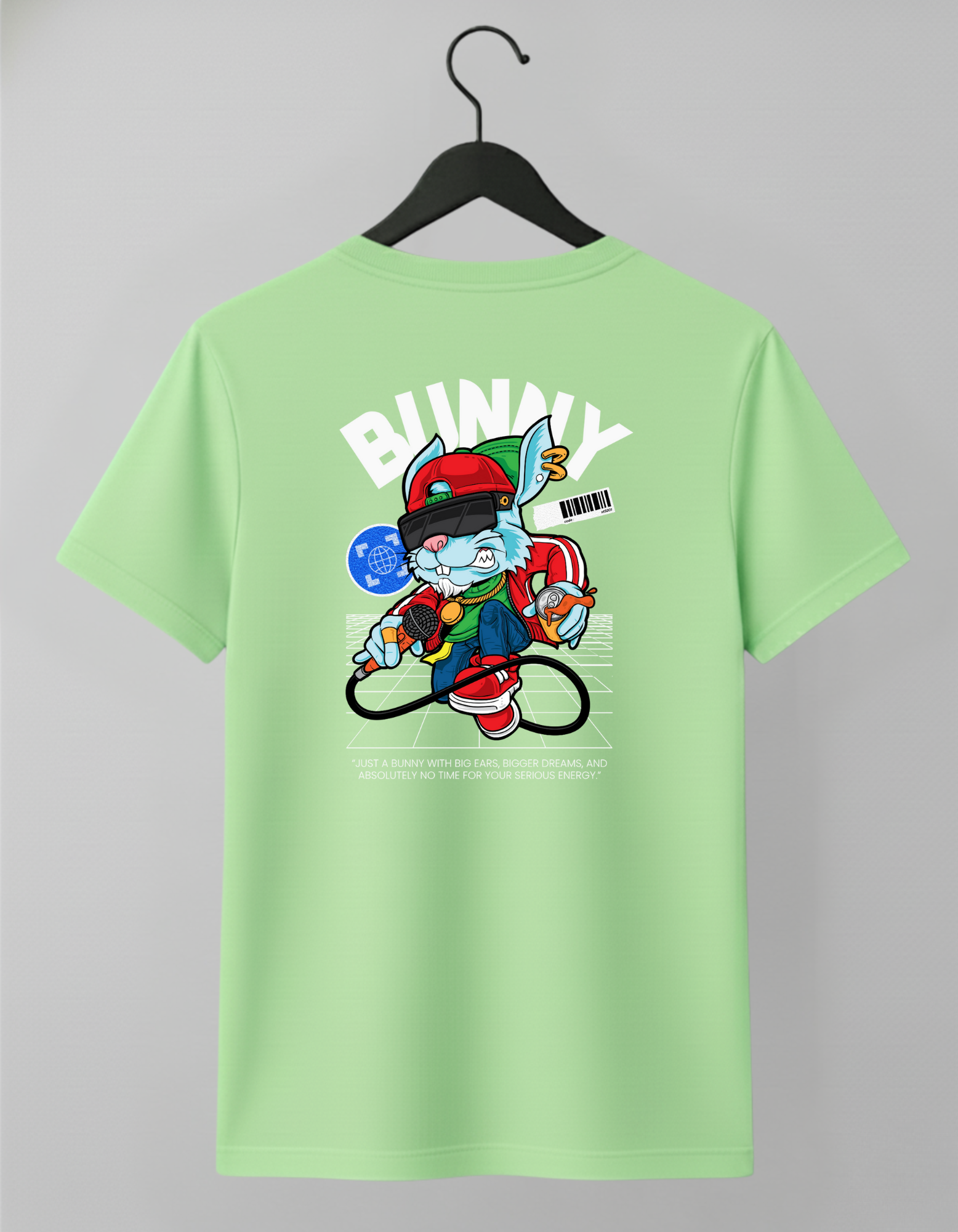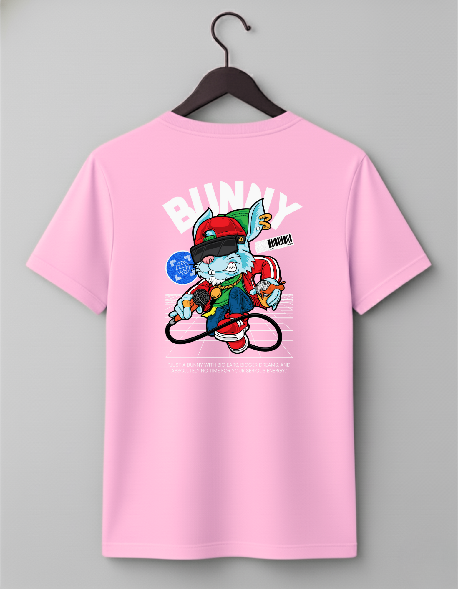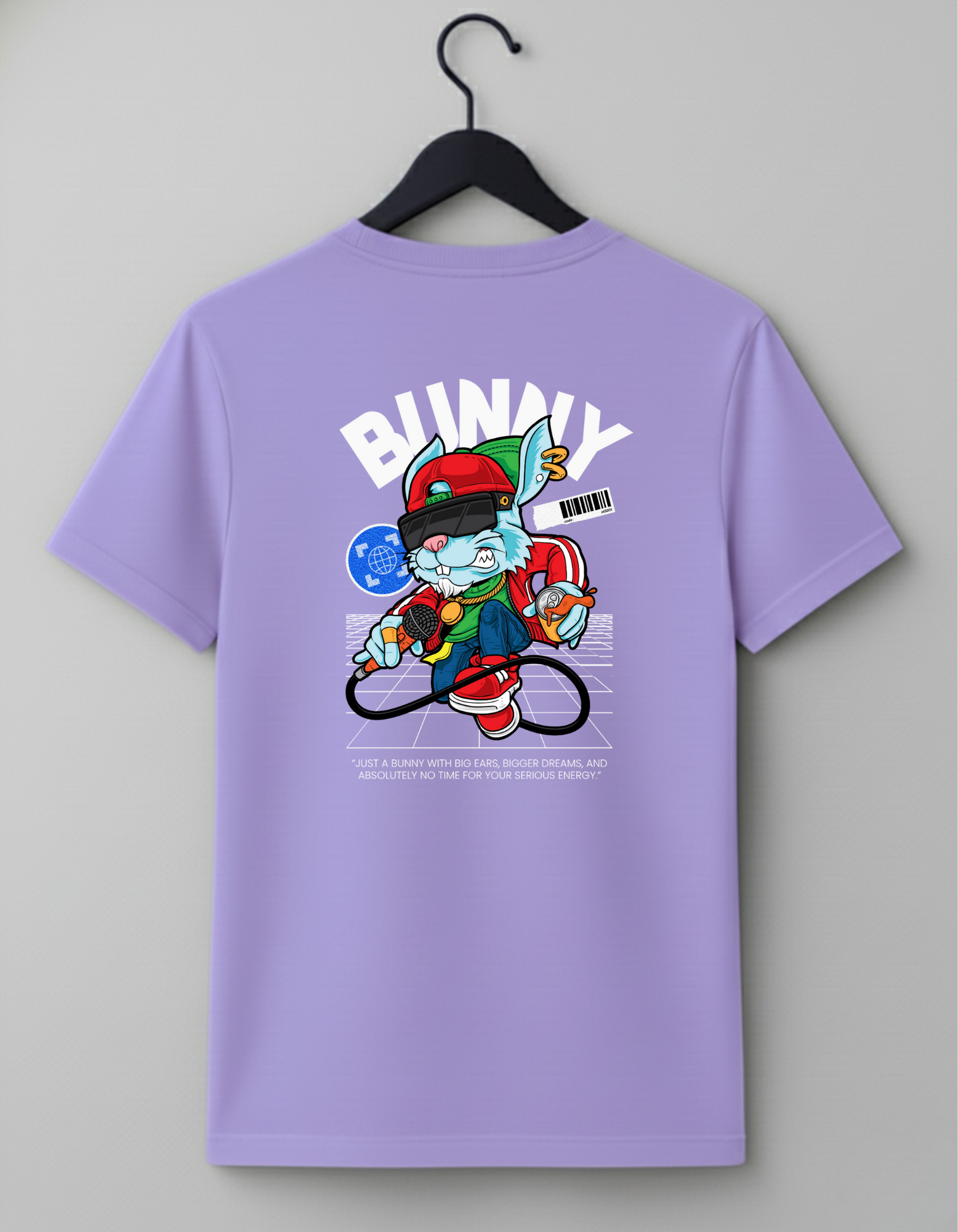This 180 GSM Cotton t-shirt is a bold crossover of hip-hop culture, digital art, and playful rebellion. It features a cool, cartoon bunny character wearing street gear and a VR headset, standing on a grid with a microphone, ready to drop a beat—or a philosophical truth