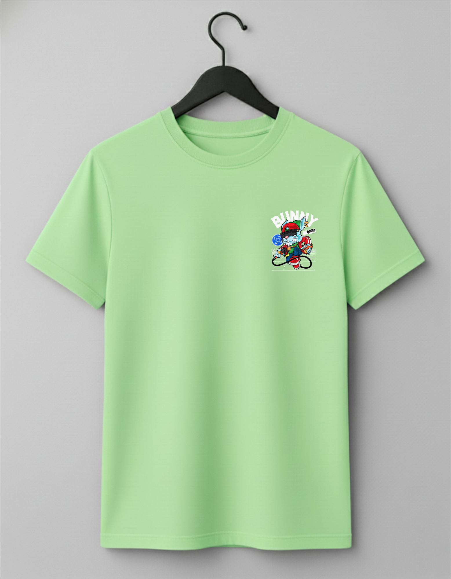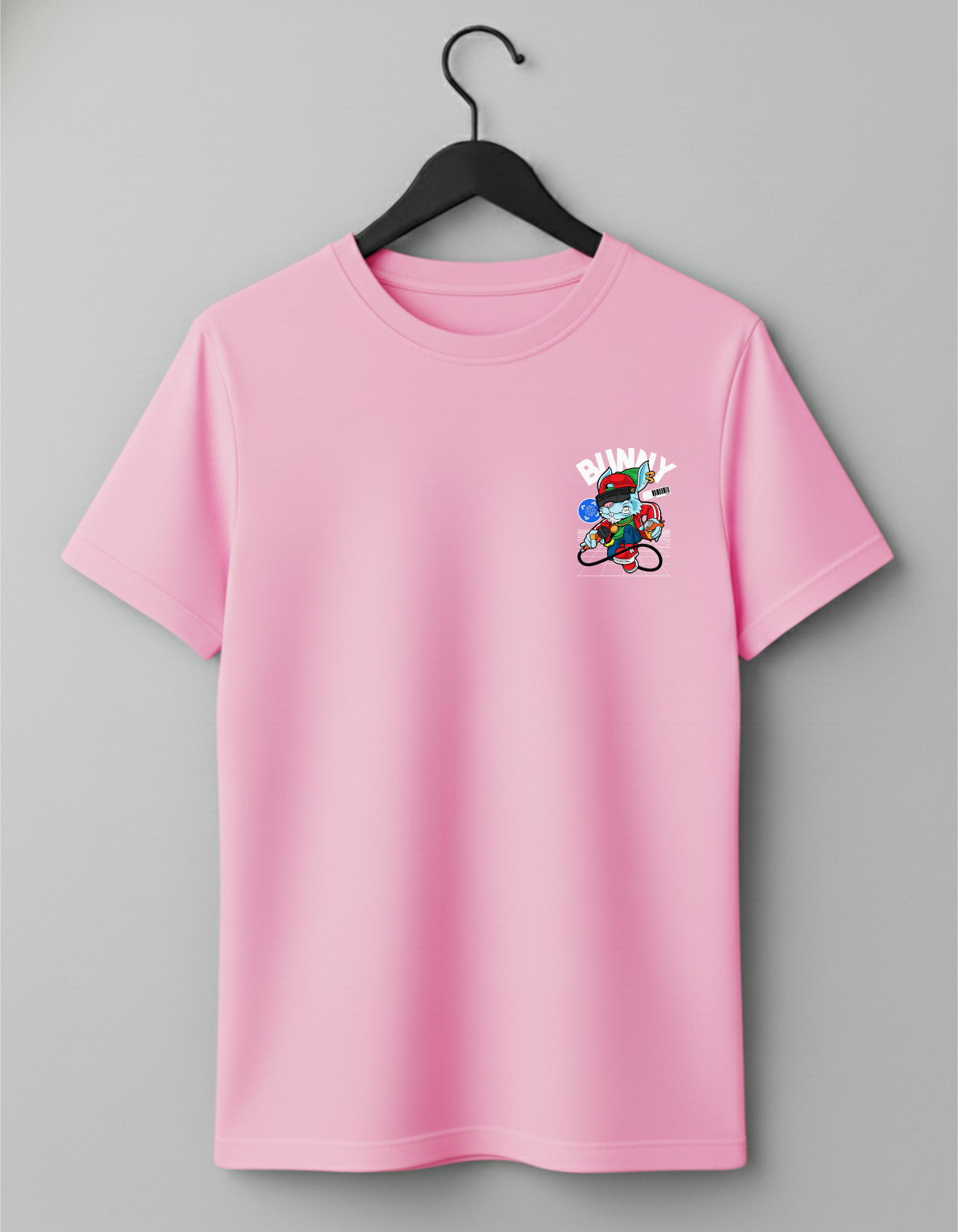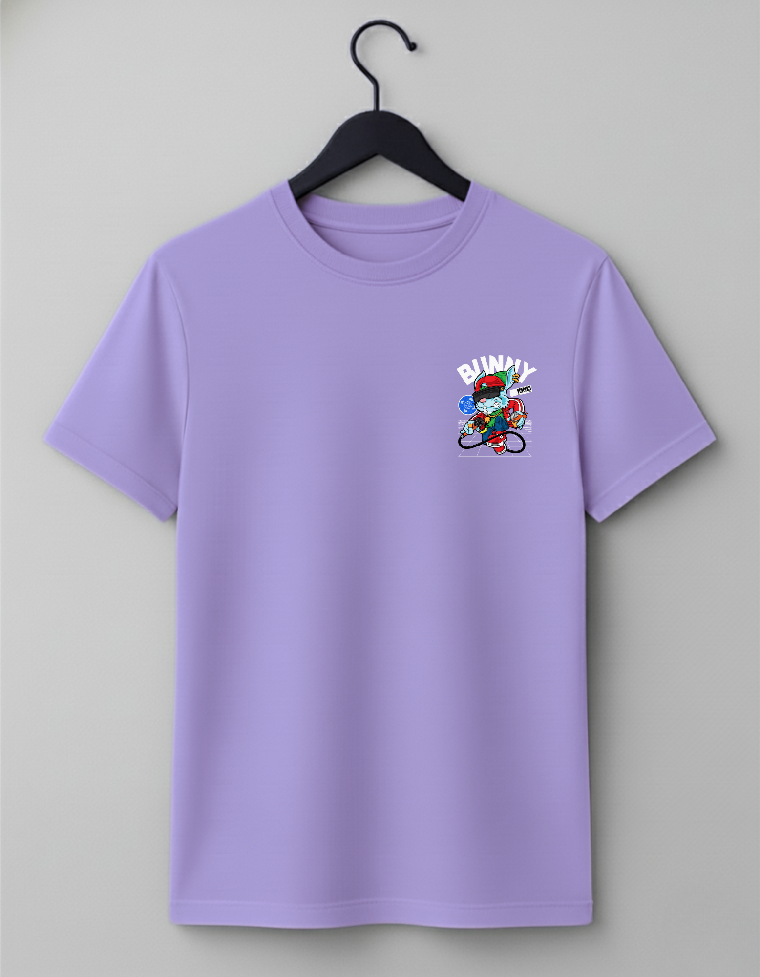 This 180 GSM Cotton t-shirt is a bold crossover of hip-hop culture, digital art, and playful rebellion. It features a cool, cartoon bunny character wearing street gear and a VR headset, standing on a grid with a microphone, ready to drop a beat—or a philosophical truth