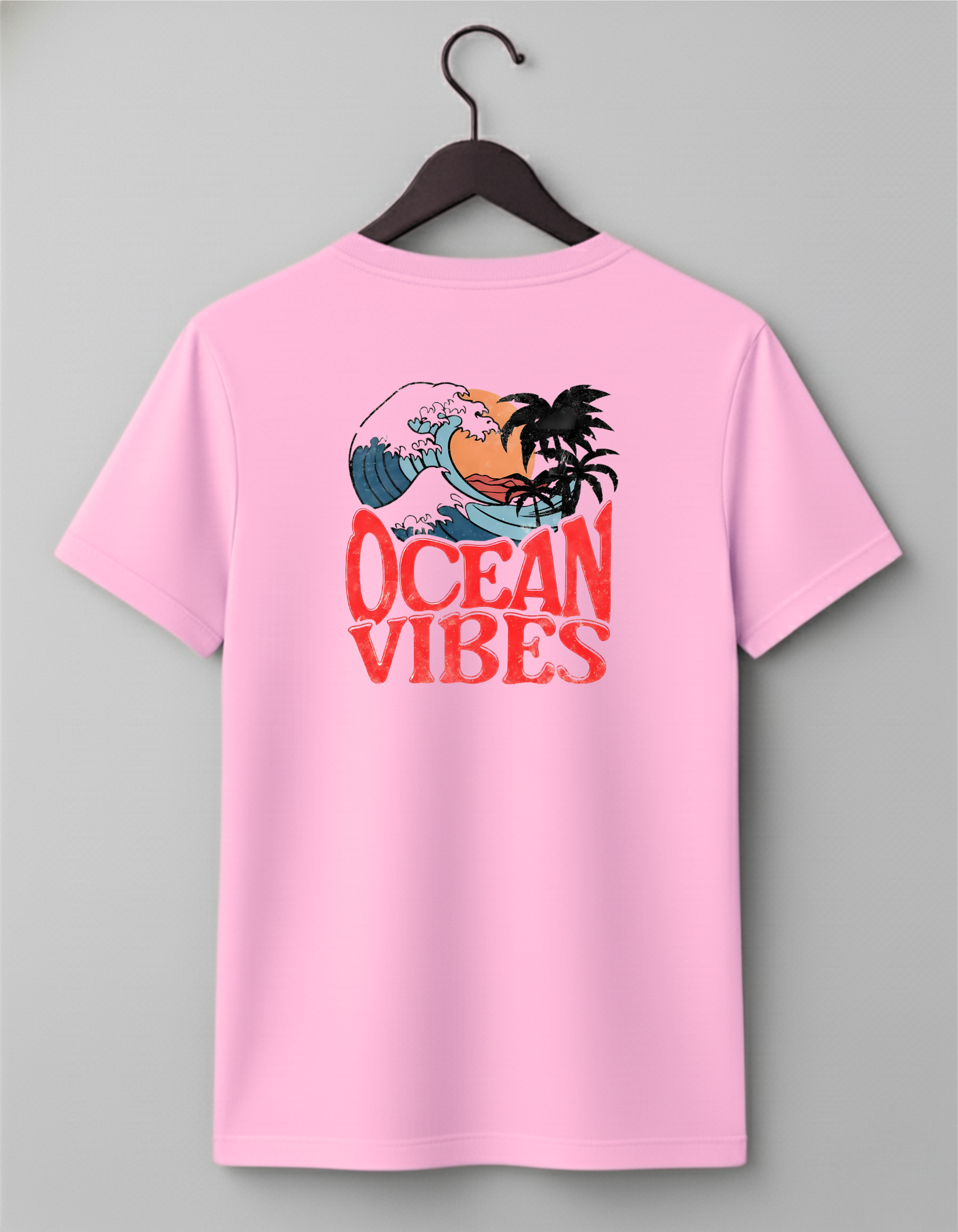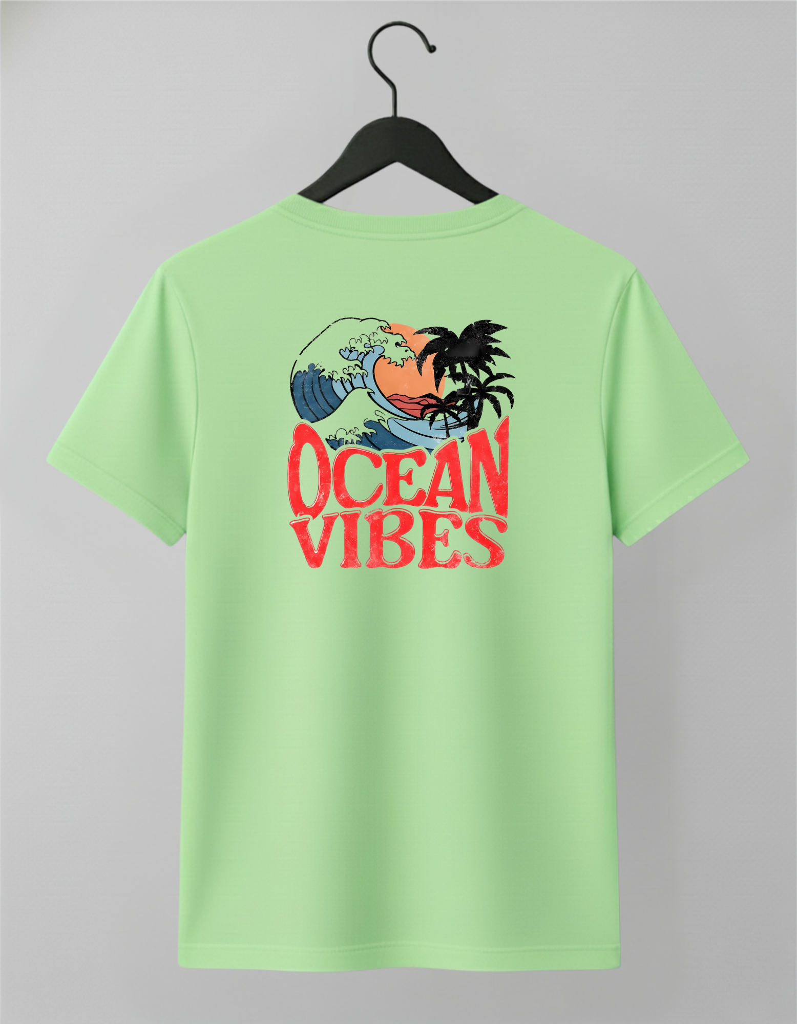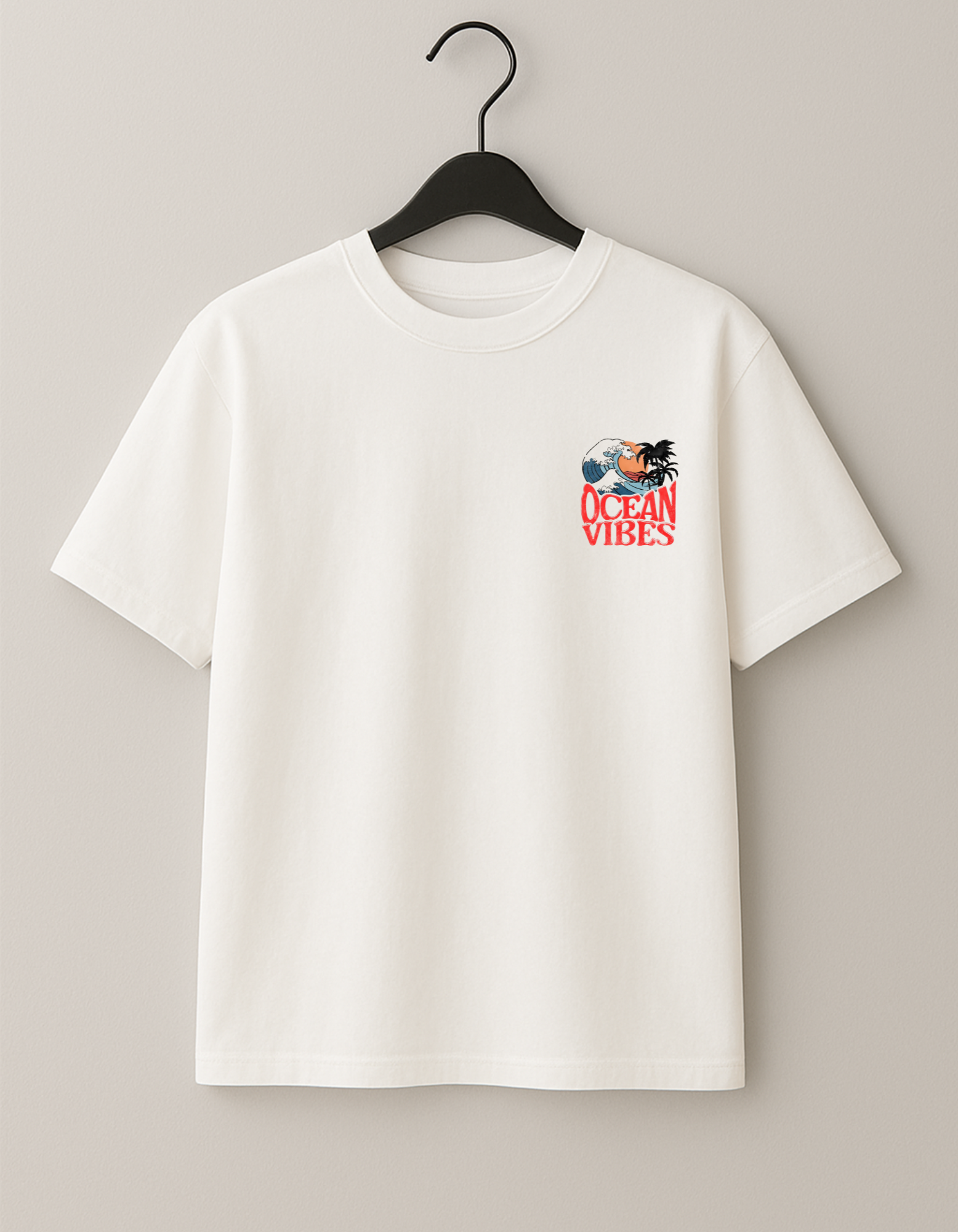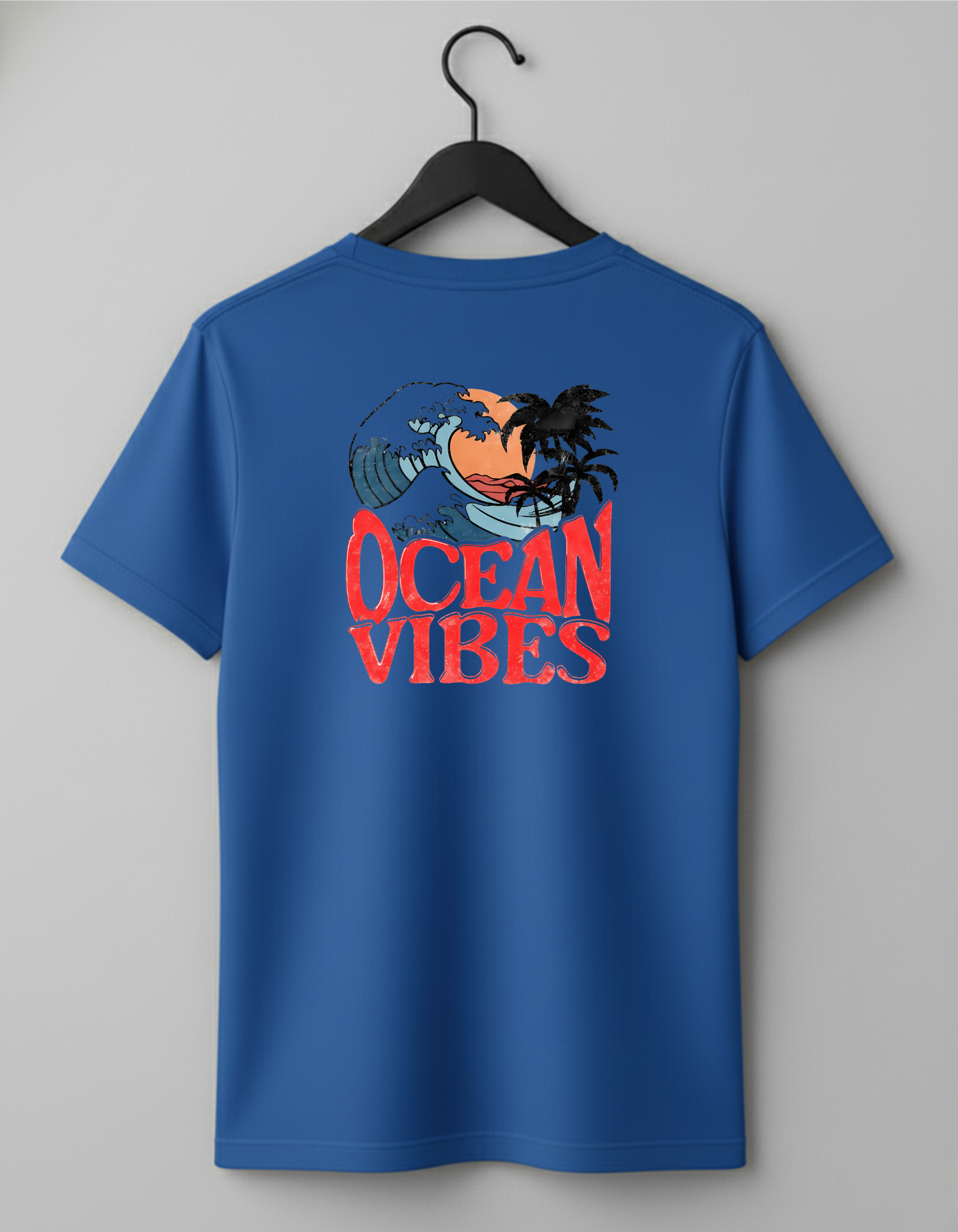 This 180 GSM Cotton t-shirt is the ultimate expression of summer nostalgia and coastal escapism. It features a distressed, vintage-style graphic combining a powerful wave, silhouetted palm trees, and the bold, grunge-textured text "OCEAN VIBES