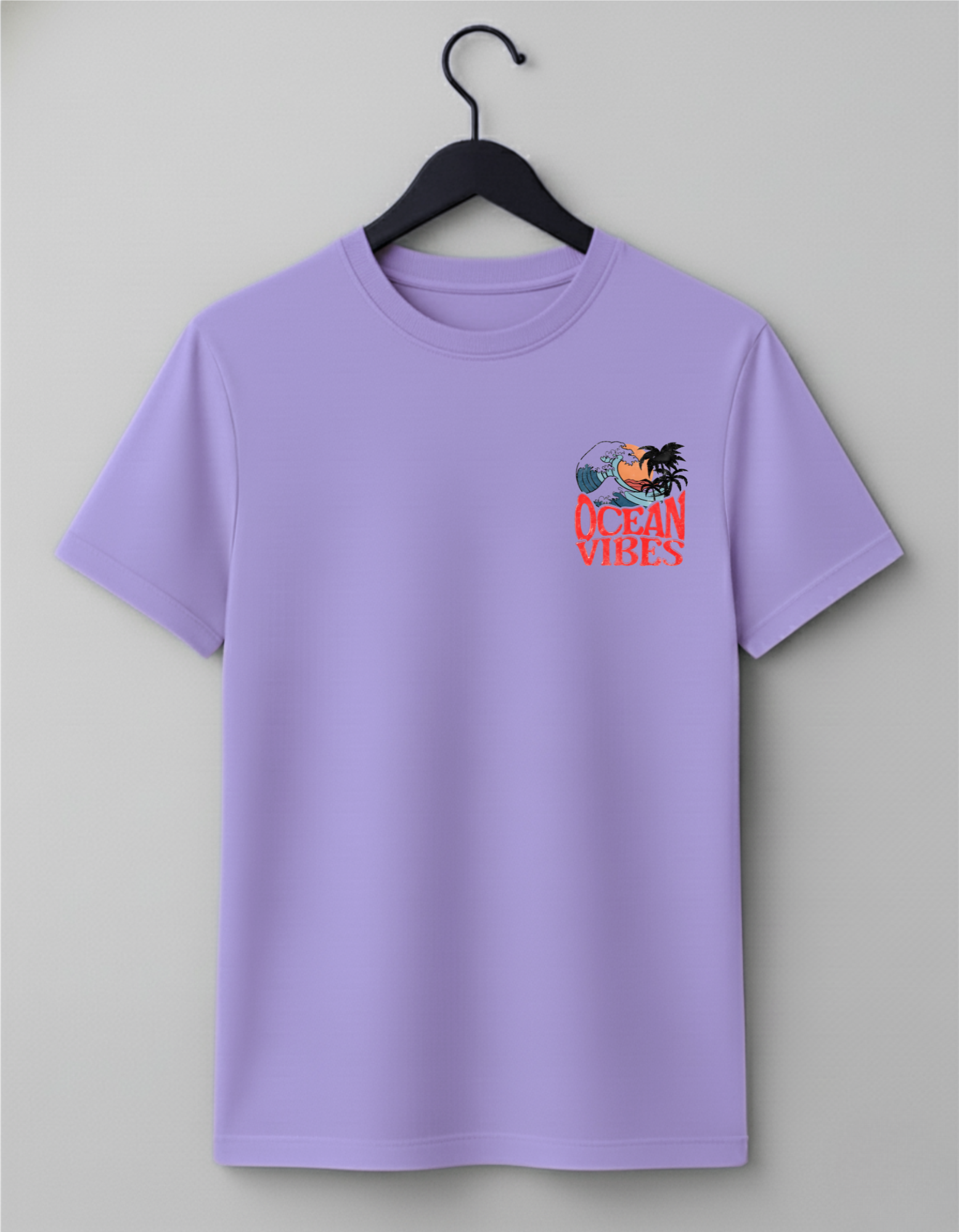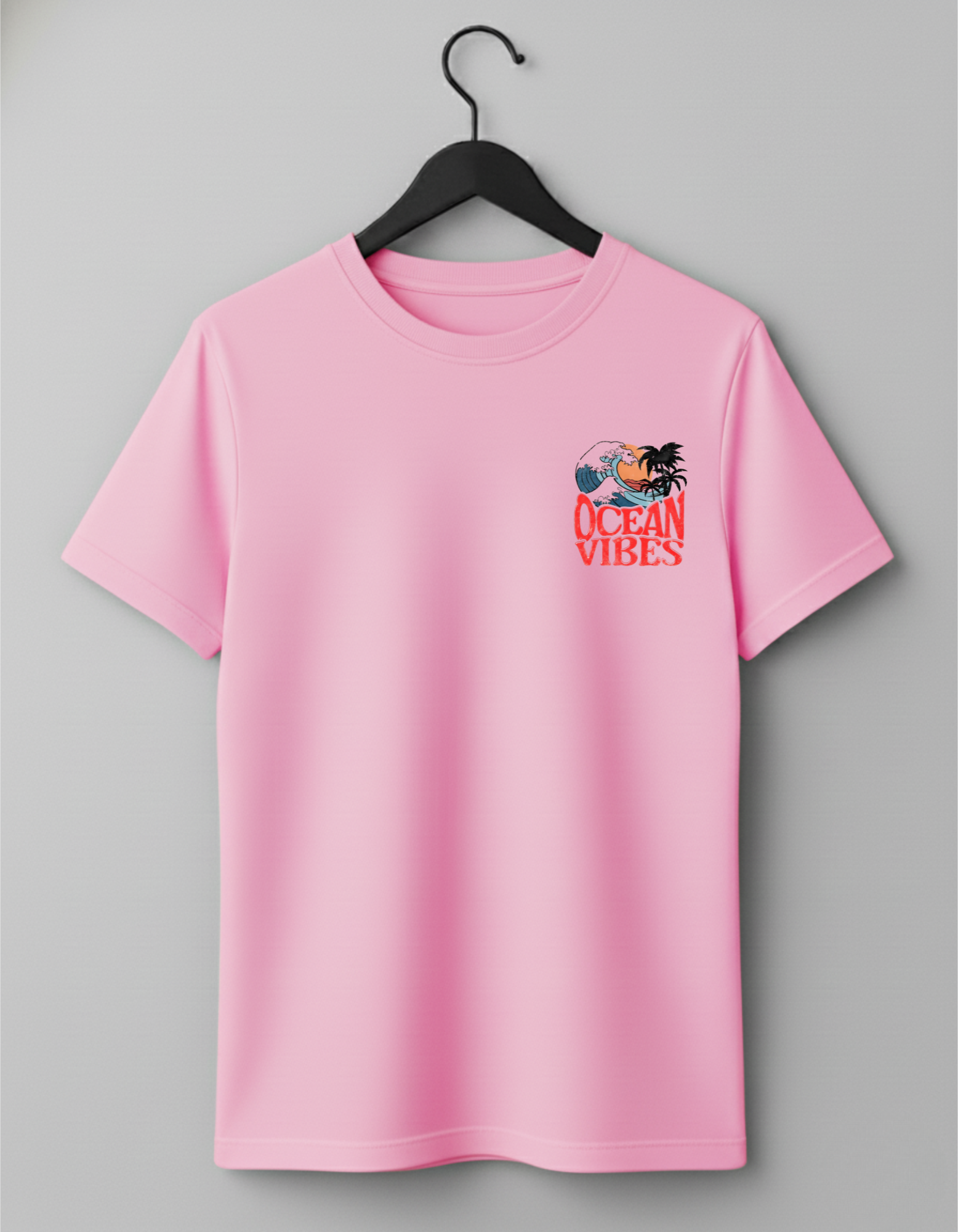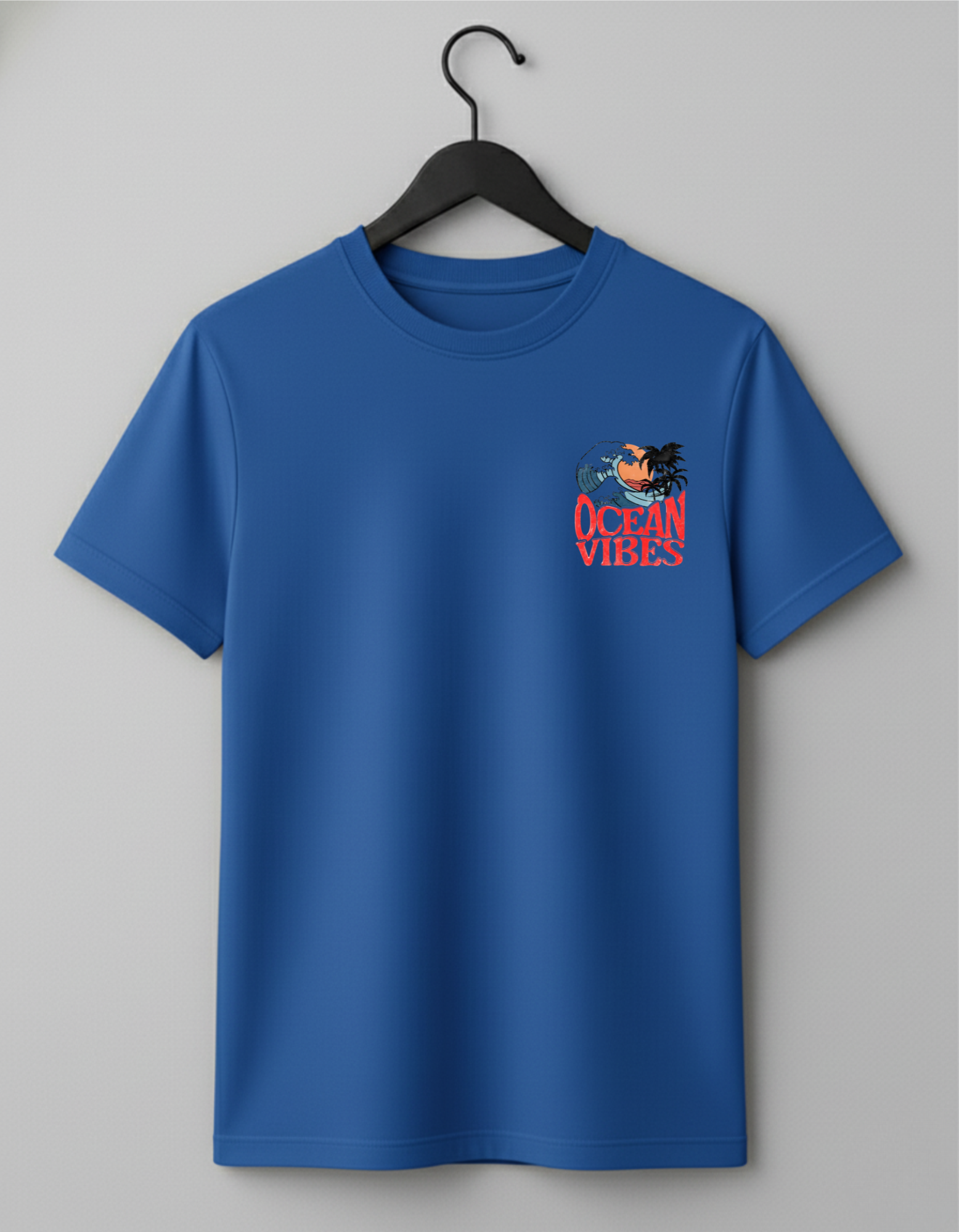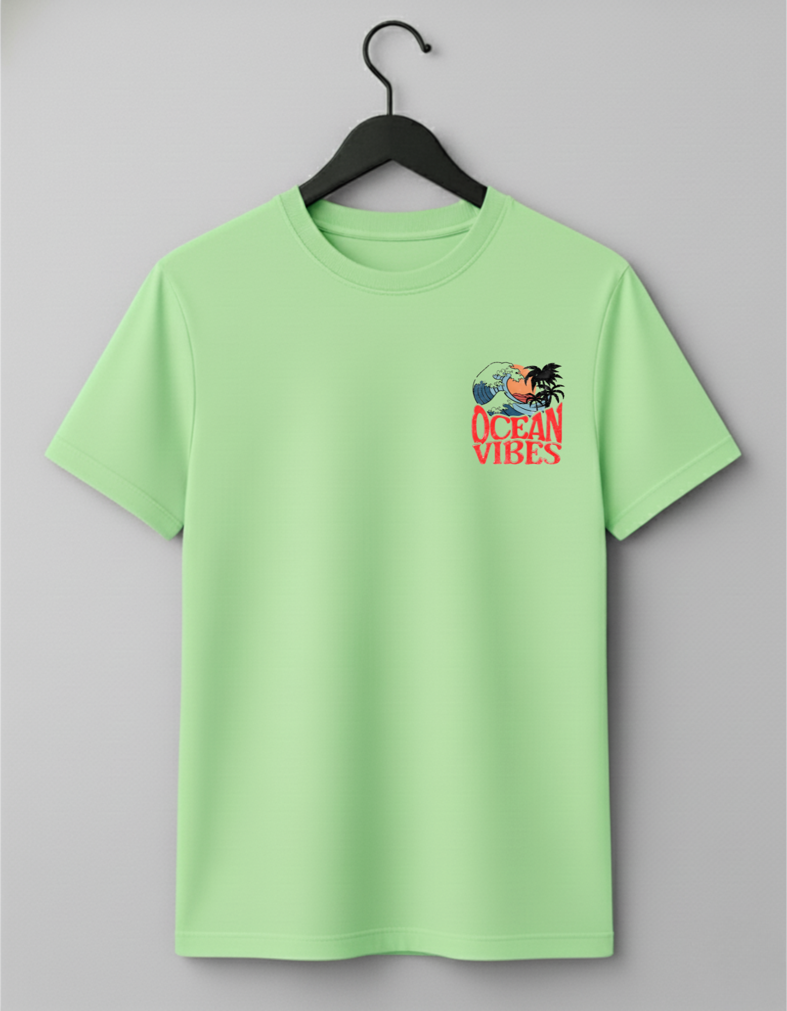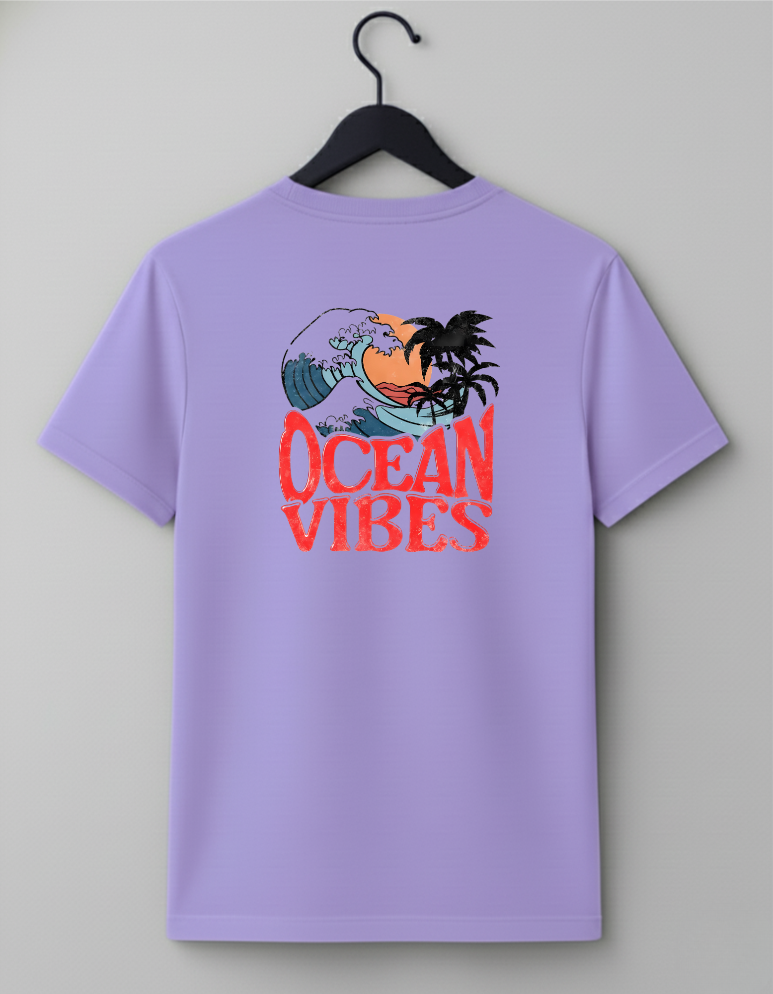 This 180 GSM Cotton t-shirt is the ultimate expression of summer nostalgia and coastal escapism. It features a distressed, vintage-style graphic combining a powerful wave, silhouetted palm trees, and the bold, grunge-textured text "OCEAN VIBES