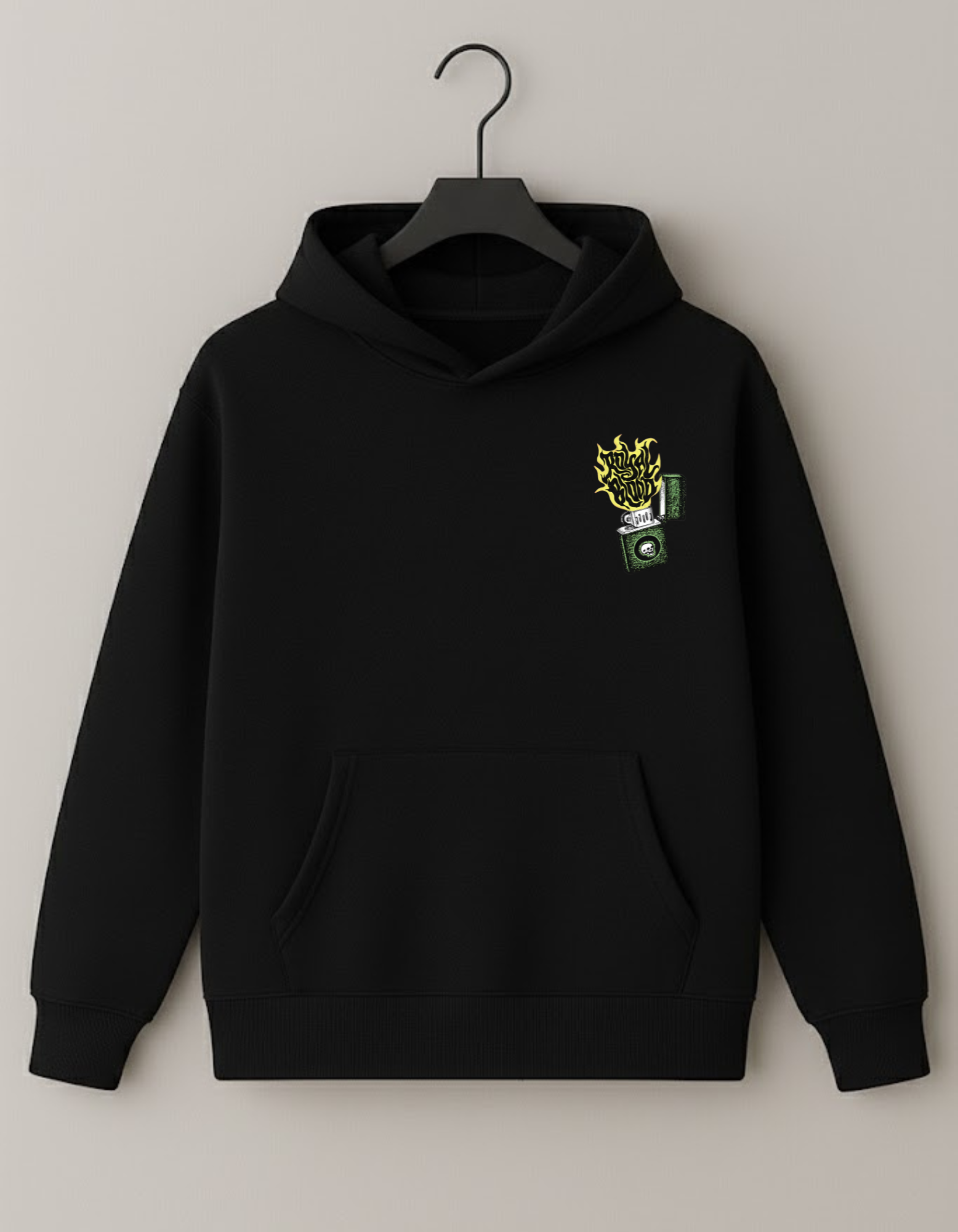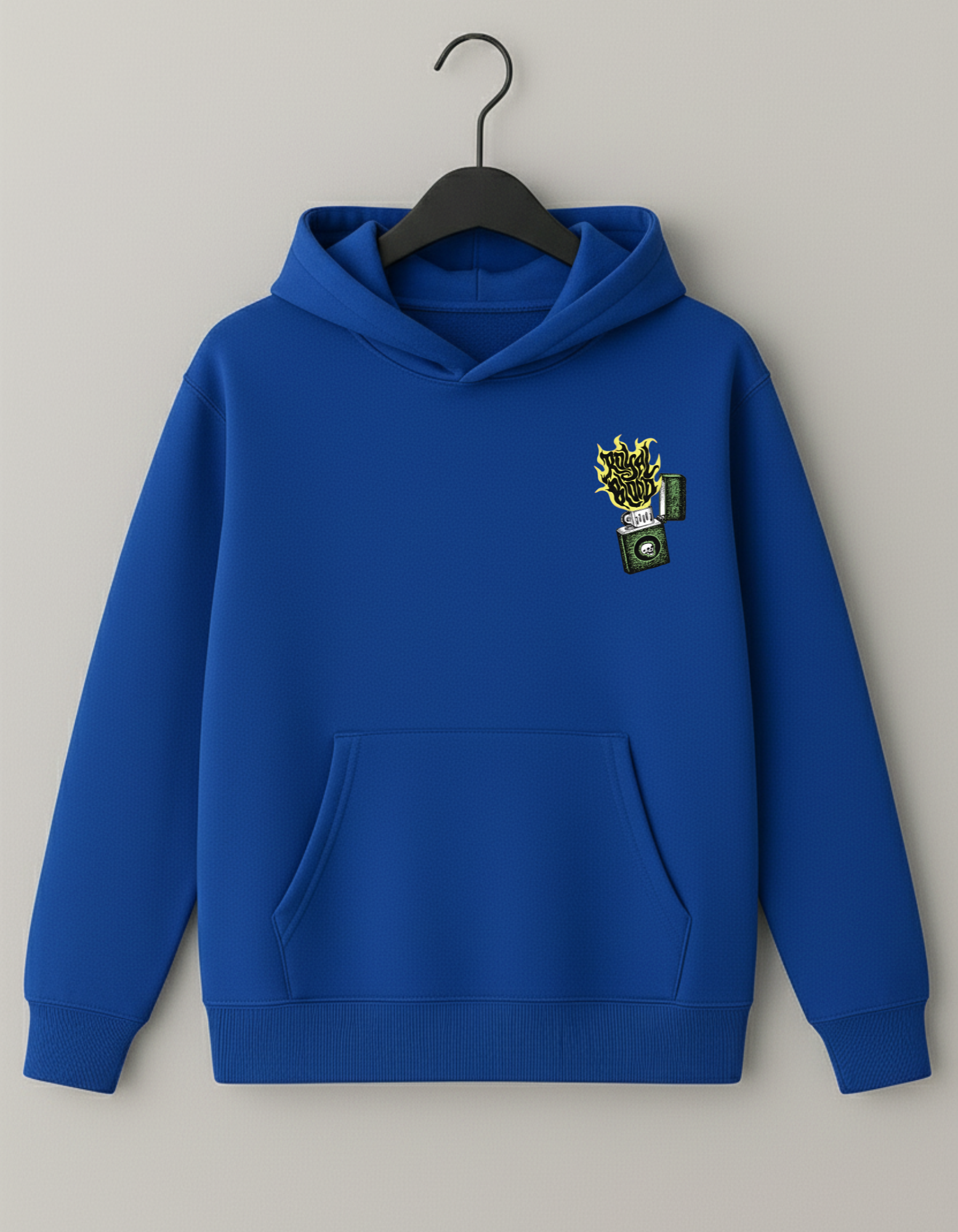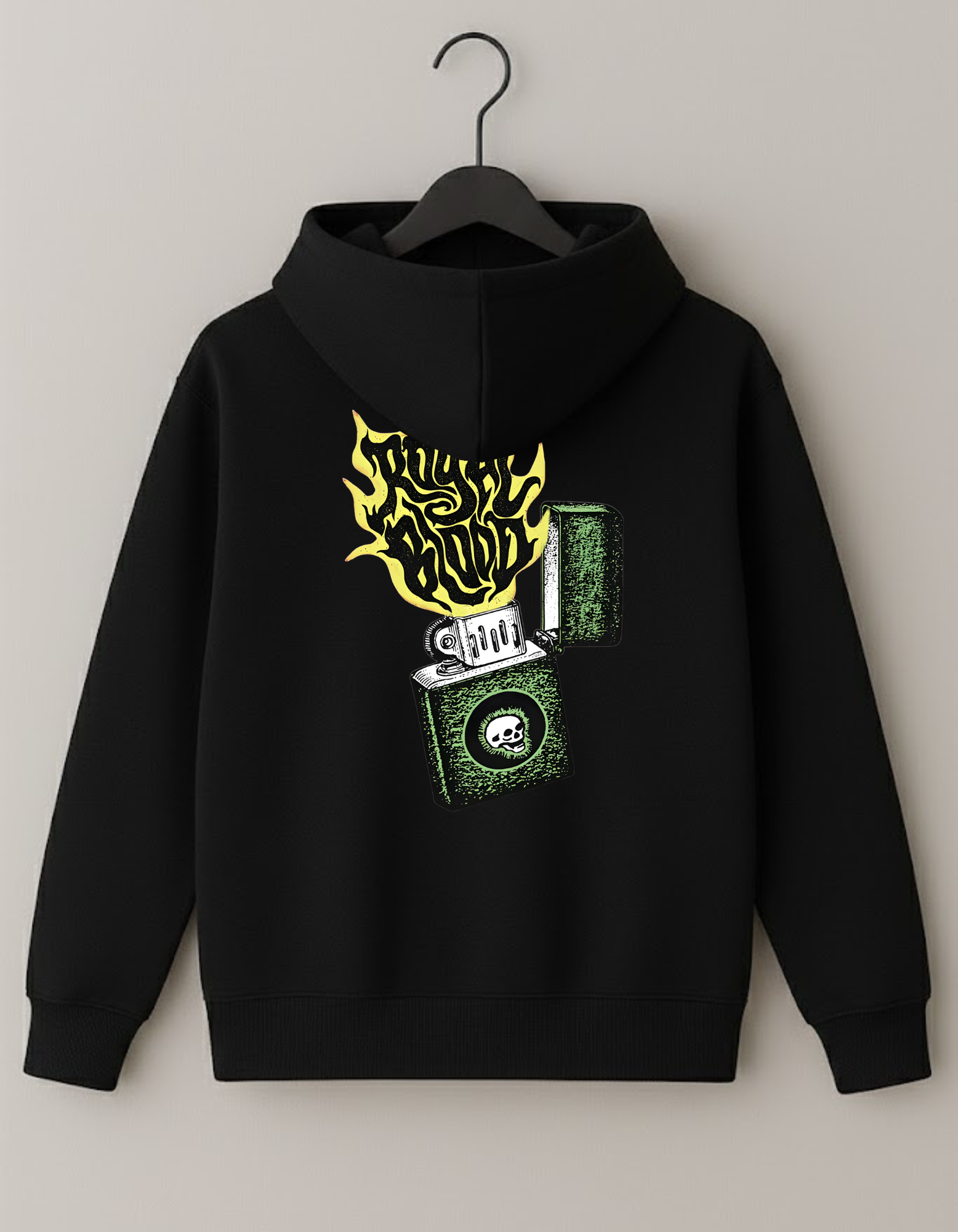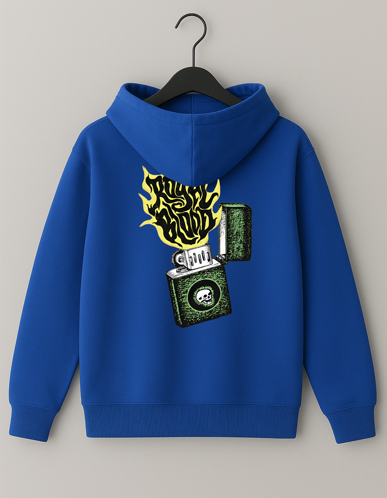 Ignite your vibe with this crimson hoodie—featuring a vintage lighter graphic and blazing “Royal Blood” flame, made for those born to stand out
