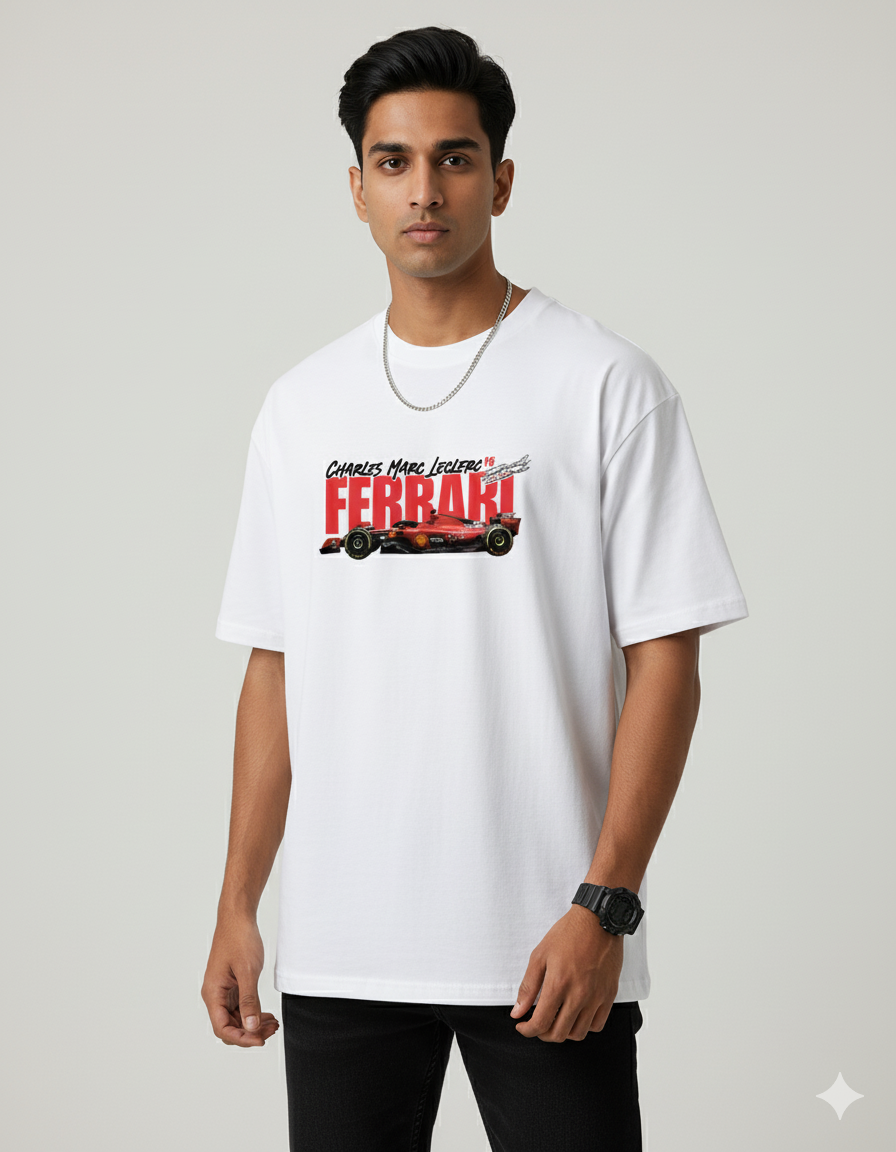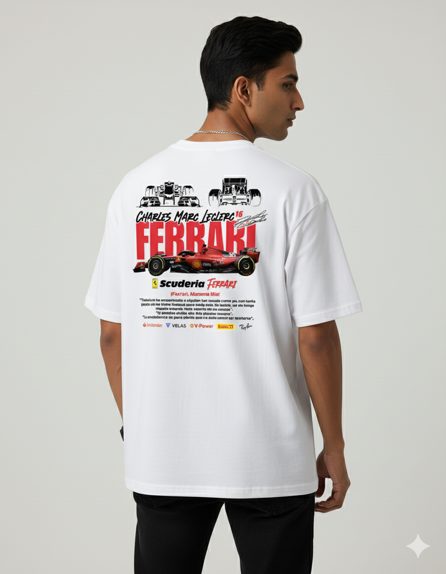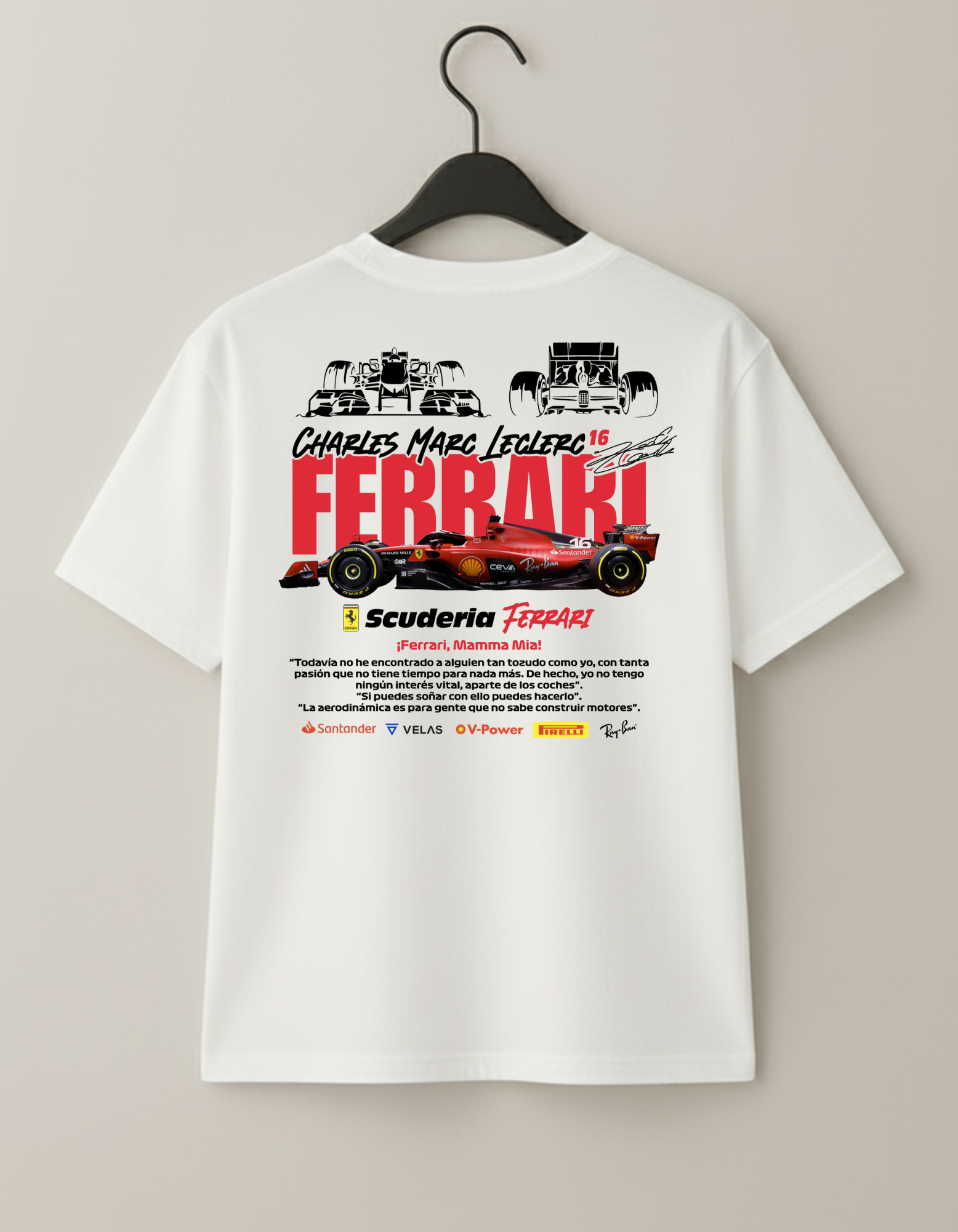 A must-have for every Tifosi. Celebrate the passion of Formula 1 with this tee featuring Ferrari's star driver, Charles Leclerc, and his iconic car.